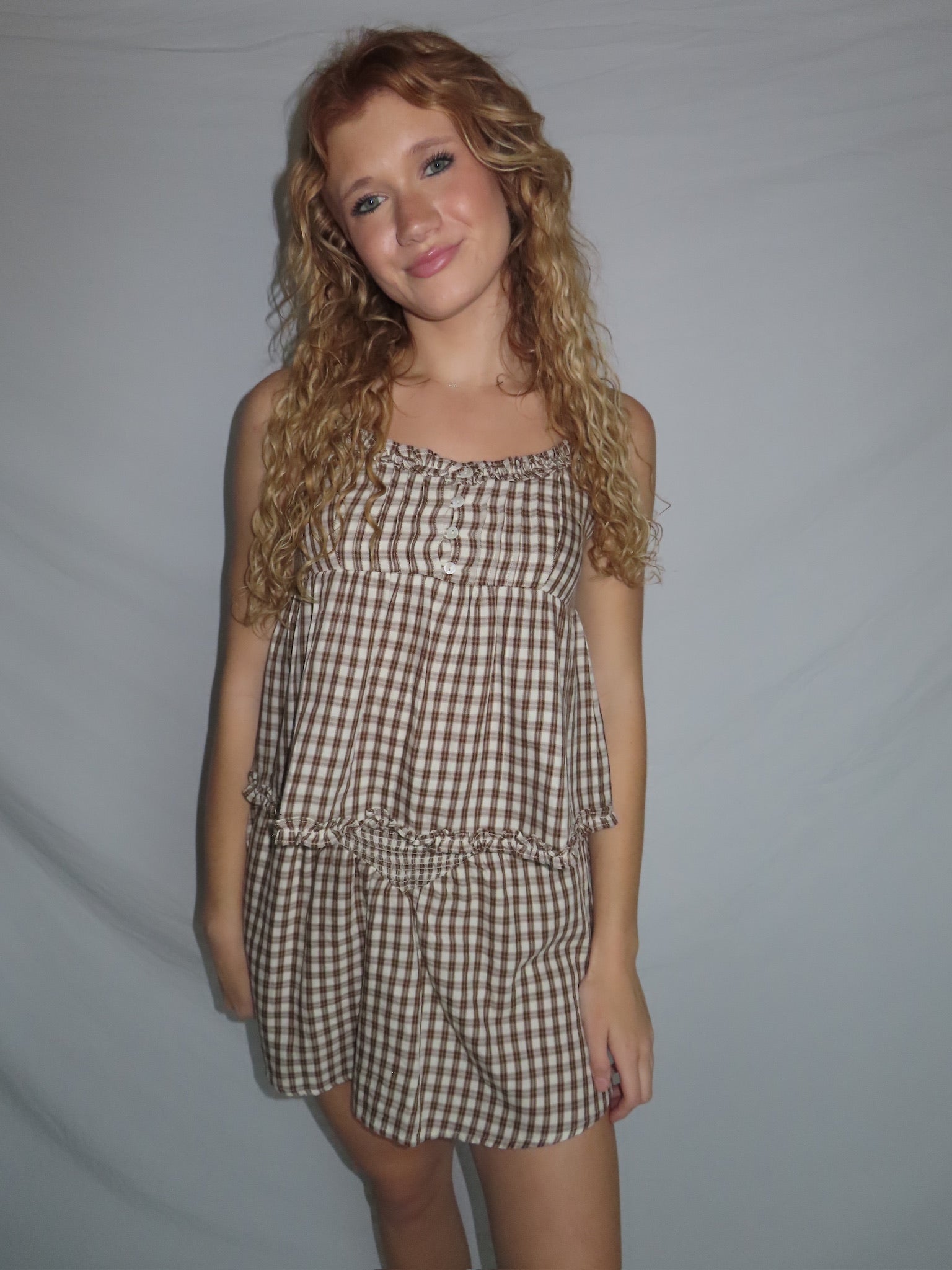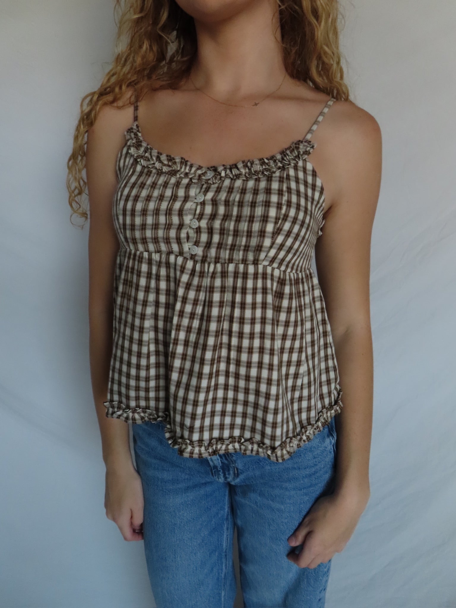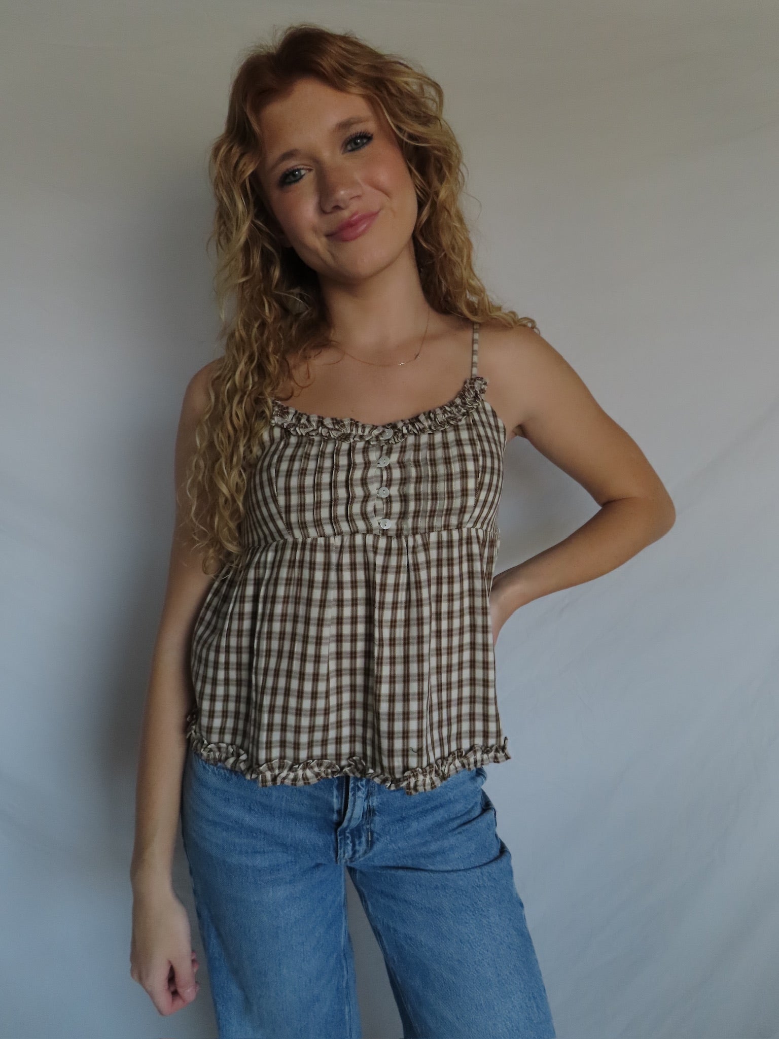 This button-front tank features a ruffled neckline and adjustable straps, making it perfect for effortless layering.